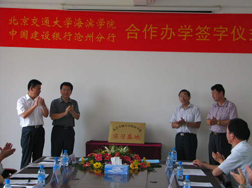 仪式由王大勇执行院长主持,王院长首先介绍了学院的总体情况及校企合作的基本思想。指出做好学院首届毕业生的就业工作是我院目前工作的重点之一,而校企合作的目的之一就是为黄骅及周边经济区发展培养专业知识过硬、动手能力强的毕业生,推动该地区的经济发展。中国建设银行沧州分行韩文金行长对我院办学取得的成绩表示祝贺,他认为海滨学院的创办结束了沧州地区无本科院校的历史,为沧州地区的经济、文化发展带来新的活力,推动沧州地区的经济更加快速发展。