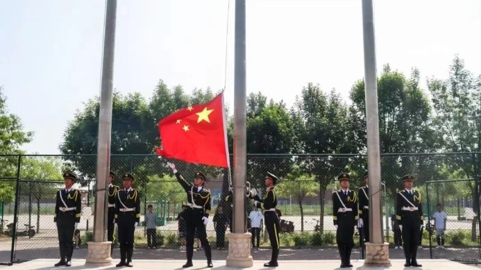 伴随着庄严的国歌,国旗护卫队的他们身着笔挺的军装,怀揣着敬意,高高扬起五星红旗,全体师生行注目礼,国旗迎风飘扬。