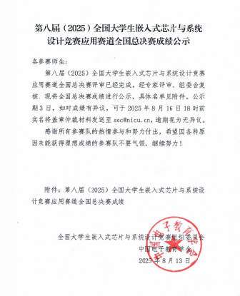 8月10日至13日、由中国电子学会指导、中国电子教育学会主办的第八届全国大学生嵌入式芯片与系统设计竞赛全国总决赛在南京集成电路培训基地圆满落幕。我校首次组队参加该项赛事,在本次竞赛中,由我校电子与电气工程学院选派的两支参赛队双双荣获全国三等奖。