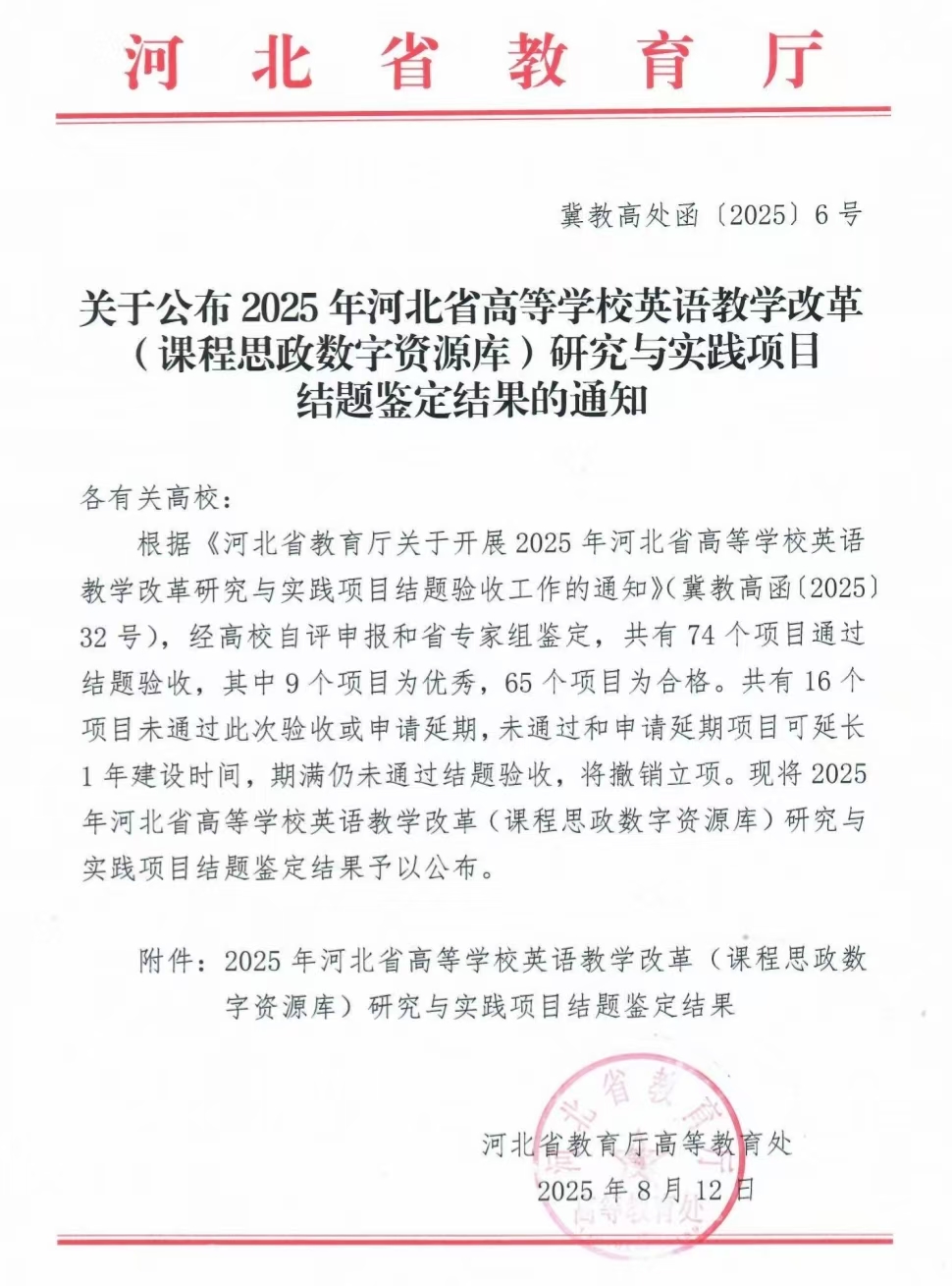 近日,河北省教育厅发布了《关于公布2025年河北省高等学校英语教学改革(课程思政数字资源库)研究与实践项目结题鉴定结果的通知》(冀教高函〔2025〕6号),由我校外国语学院陆朝霞老师主持的“中国文化自信视域下英语演讲课程思政数字资源库构建及应用路径”项目顺利通过结项验收。